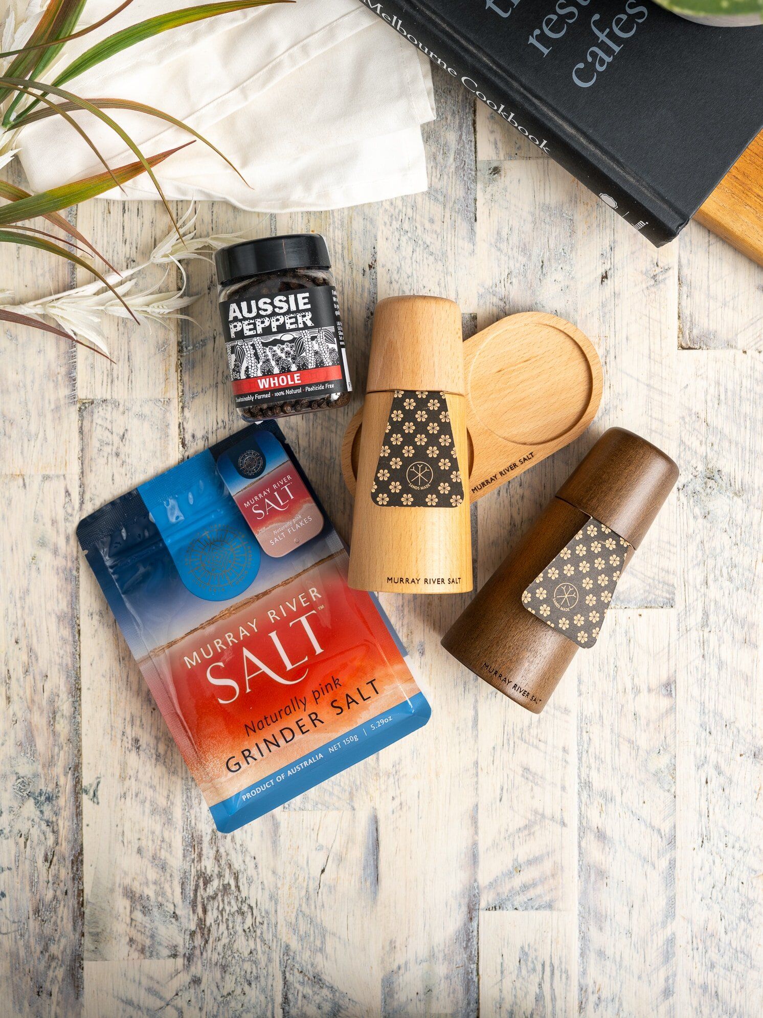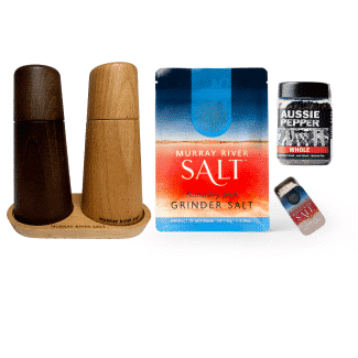 Featuring Murray River Salt Grinder Salt, harvested from ancient underground brines in Australia’s pristine outback, and bold, aromatic Australian “Aussie Pepper” WHOLE Black Peppercorns, grown sustainably, pesticide free in Tropical Far North Queensland. Put your local ingredients into Two Sands Made Mills, made from sustainably sourced timbers — one in rich Walnut and the other in smooth Beechwood. Both mills are housed in a minimalist wooden tray, perfectly designed to keep your countertop neat while showcasing the natural beauty of the materials.