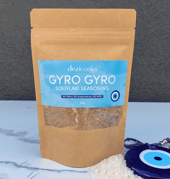 Gyro Gyro Souvlaki Seasoning: Greek Dried Oregano, Murray River Pink Salt Flakes, Sweet Paprika, Garlic Powder, Garlic Granules, Mustard Powder, White Pepper.